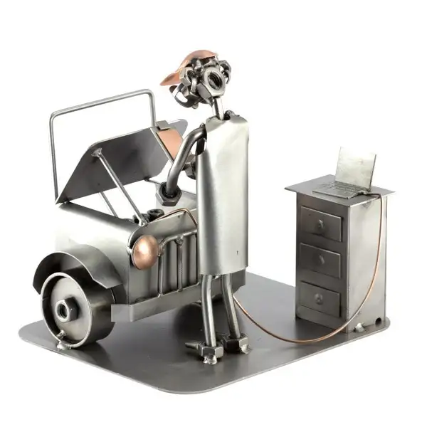 Het beeldje Automonteur met computer is gemaakt van moeren en staal.
