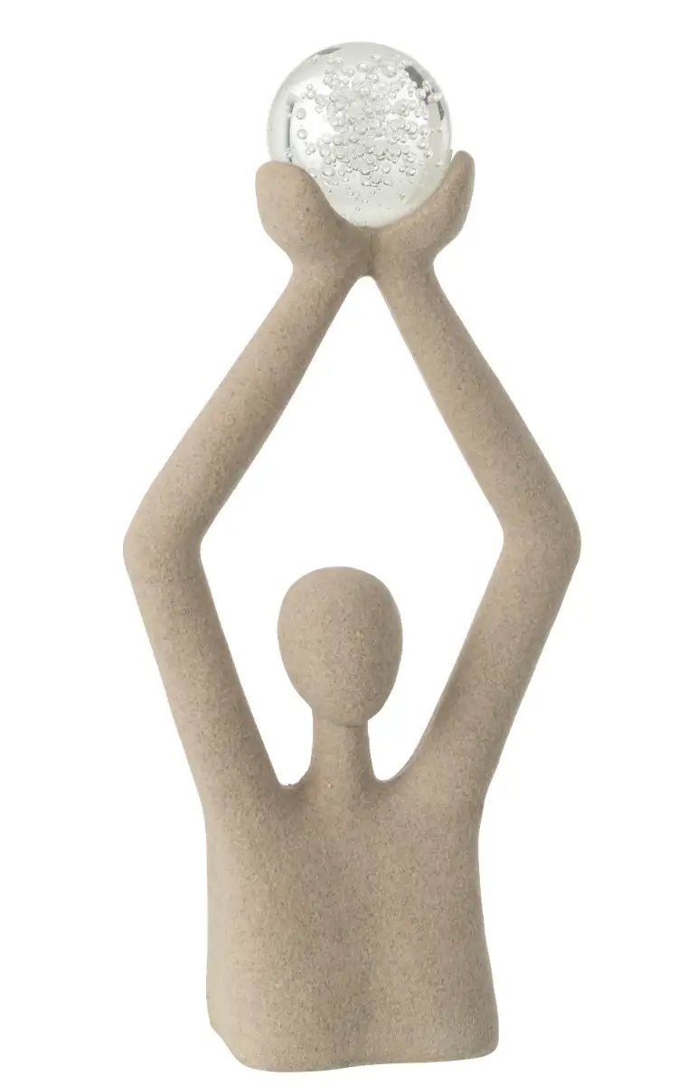 Dit indrukwekkende beeld van een persoon die een bal boven het hoofd houdt straalt kracht, balans en elegantie uit. De combinatie van beige polyresin en een transparante kristalglazen bal geeft het kunstwerk een moderne en verfijnde uitstraling. De bustevorm en verticale compositie maken dit beeld tot een echte blikvanger in elk interieur.
