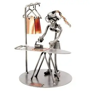 Het beeldje huisvrouw is gemaakt van moeren en staal