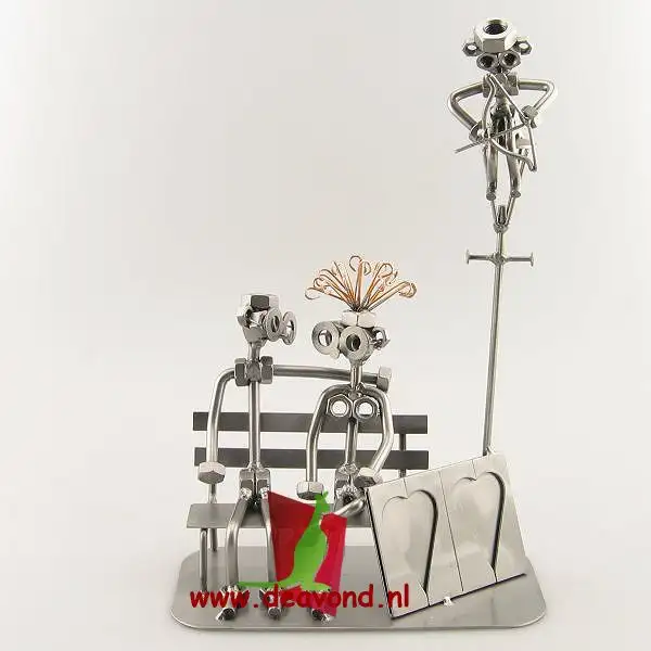 Het beeldje liefdespaar op een bankje is gemaakt van moeren en staal